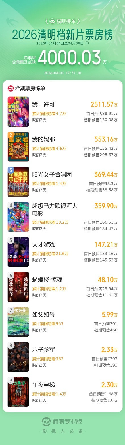 据猫眼专科版数据,铁心4月1日17时37分,Dafabet2026年明朗档新片预售总票房破4000万,雅博(中国)app《我,许可》《我的妈耶》《阳光女子齐唱团》暂列明朗档新片预售票房榜前三位。